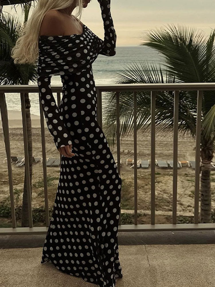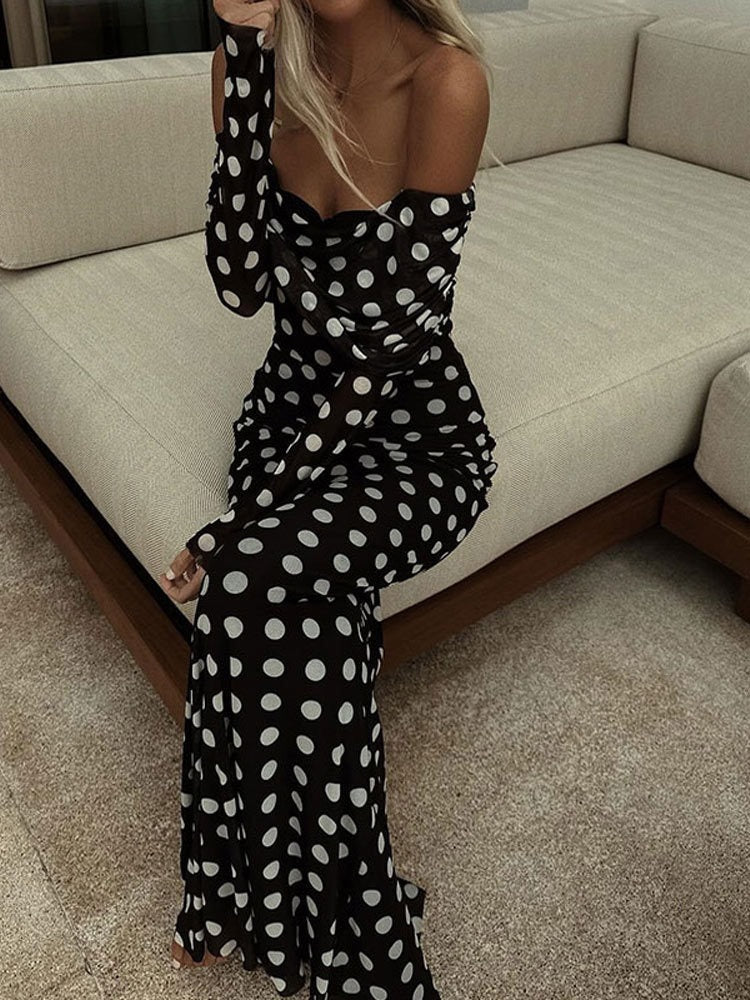 Questo abito lungo, con aderente design e spalle scoperte, è perfetto per ogni occasione grazie alla sua versatilità! Il suo tessuto a pois aggiunge un tocco di eleganza e stile, mentre il suo taglio aderente valorizza la figura femminile. Indossalo e sentiti bellissima in ogni momento!