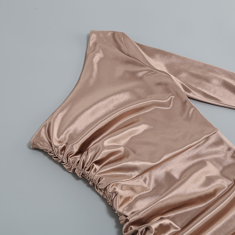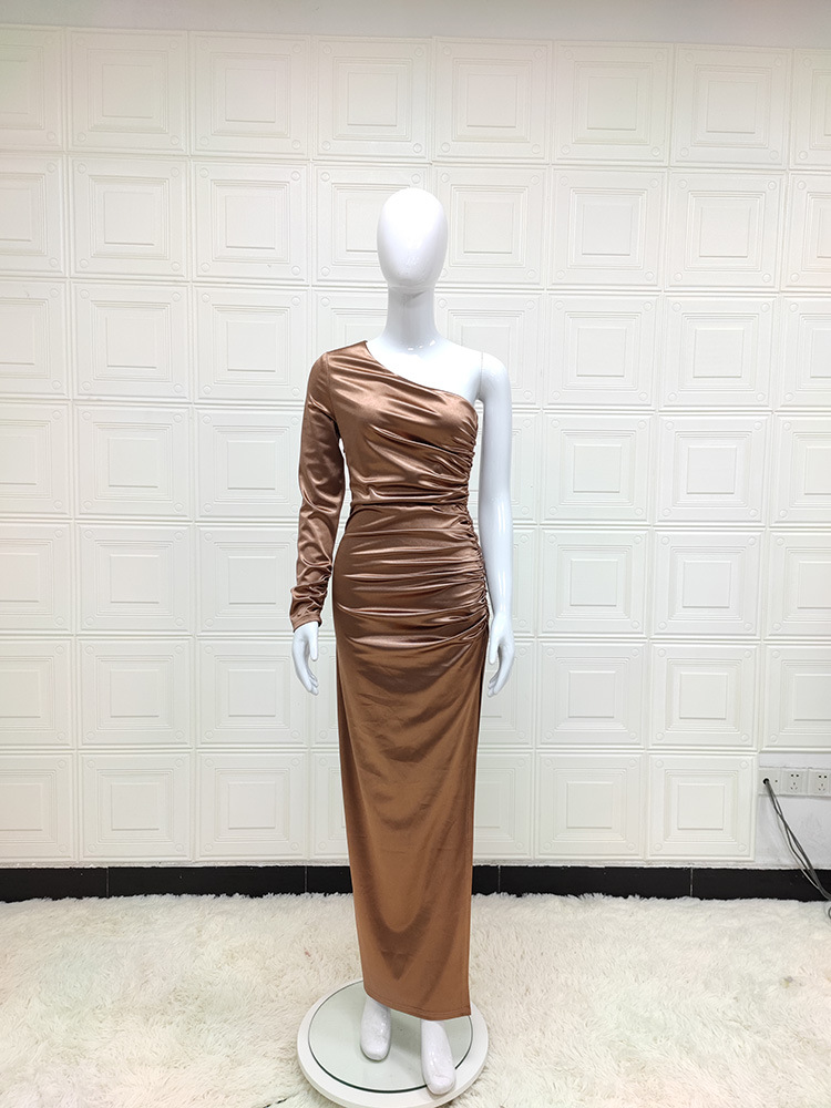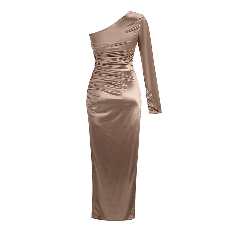 Esalta la tua eleganza con l'abito lungo monospalla in satin, perfetto per le occasioni speciali. Il suo taglio raffinato e il tessuto di qualità ti faranno risplendere. Con uno spacco laterale aggiungi un tocco di sensualità senza rinunciare alla classe. Lasciati conquistare dal suo fascino senza tempo!