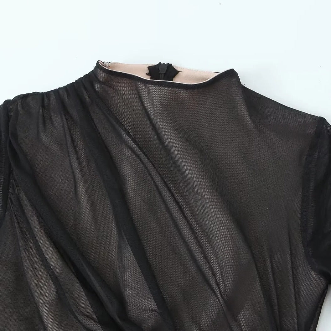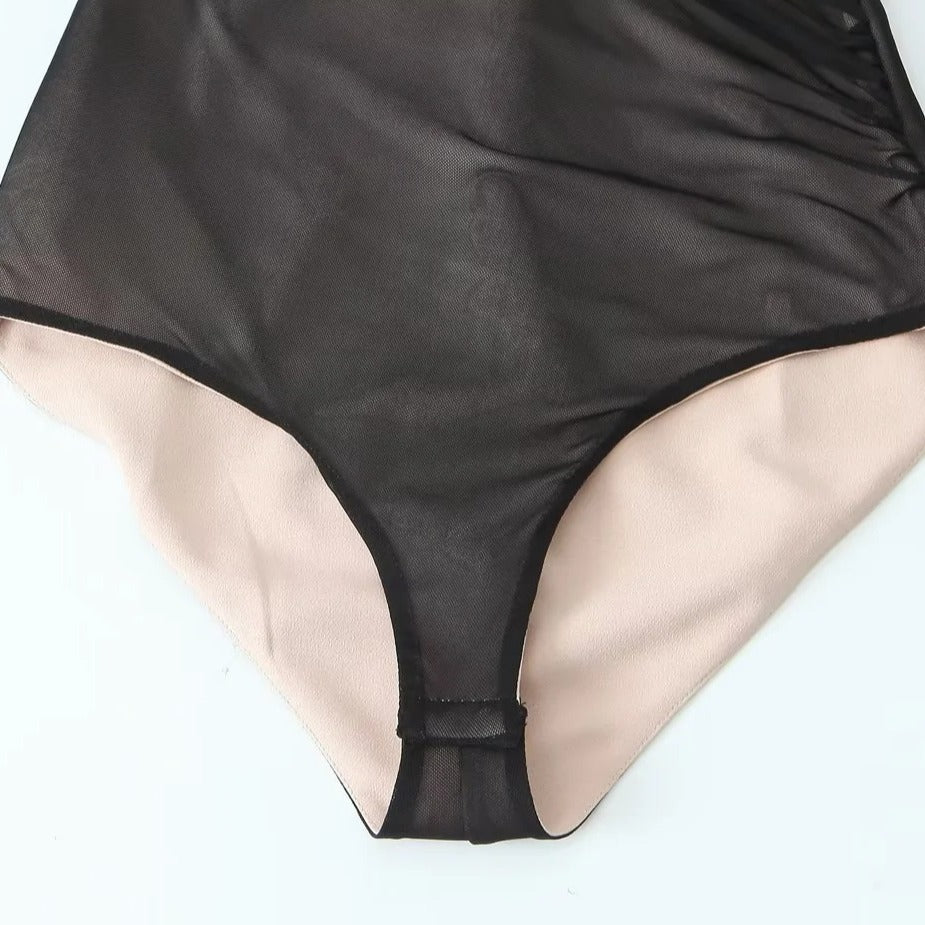 Elegante e raffinato, il nostro body in velo con drappeggio ti farà sentire come una dea greca. Il tessuto leggero e avvolgente avvolge il tuo corpo in un abbraccio divino, mentre il drappeggio aggiunge un tocco di sensualità. Regalati questo capo unico e sentiti sicura e irresistibile.