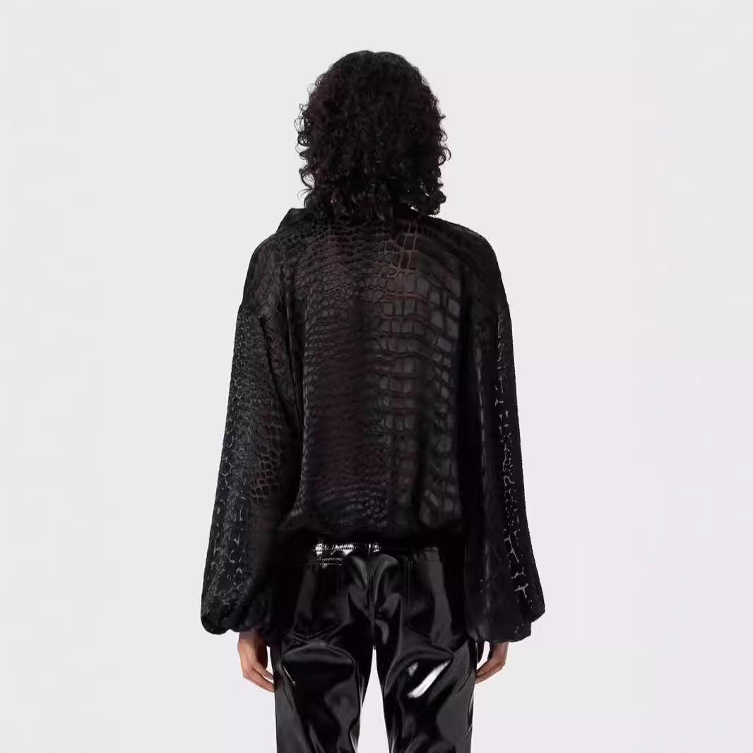 Blumarine 蓝色情人法式深V领飘带长袖衬衣女小众气质慵懒风百搭女上衣仿鳄鱼纹罩衫