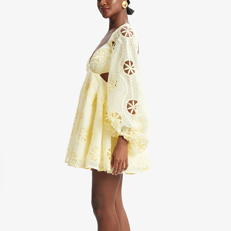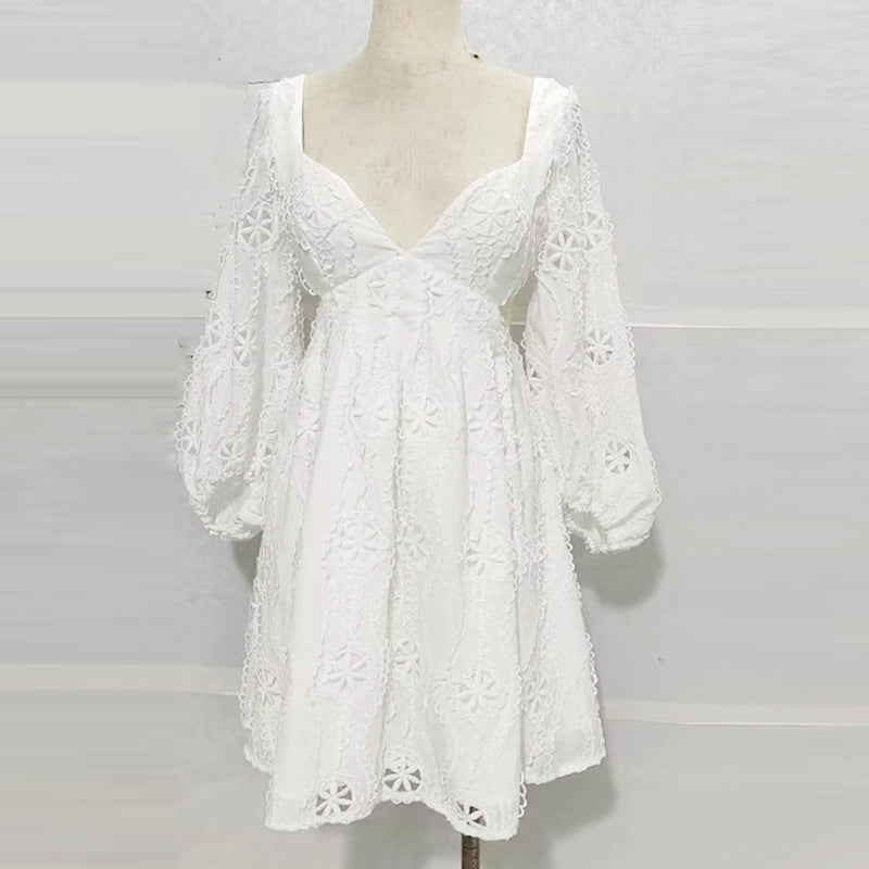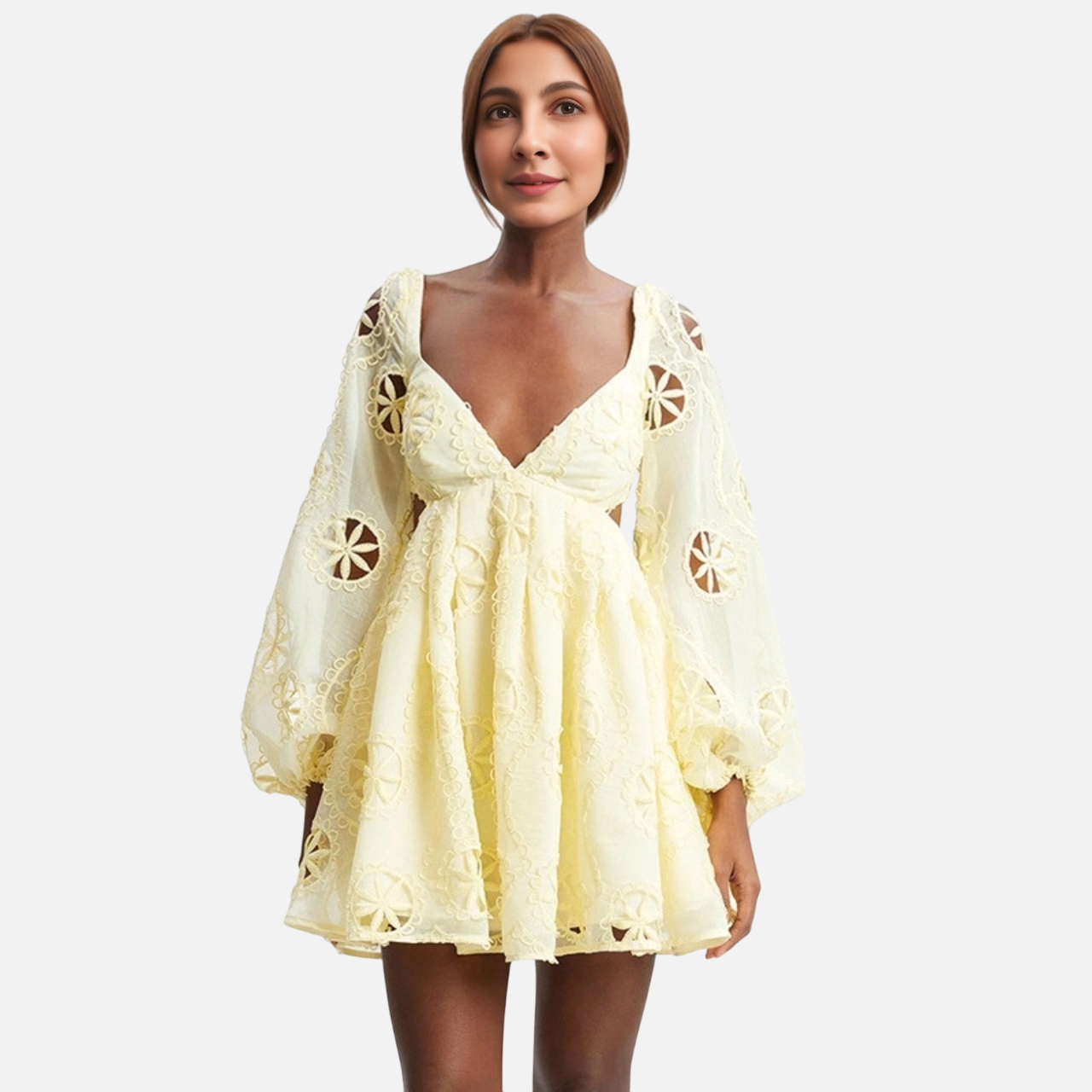 Questo mini abito ricamato incarna un'eleganza romantica senza tempo. I delicati ricami aggiungono un tocco di raffinatezza, mentre la linea corta valorizza la silhouette con grazia. Perfetto per serate speciali o momenti in cui desideri sentirti unica e affascinante, questo abito trasforma ogni occasione in un ricordo indimenticabile. Indossalo e lasciati avvolgere da un’atmosfera di dolcezza e charme.